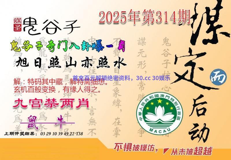 | 314期鬼谷子:旭日照山亦照水 解释:“旭日照山亦照水”描绘了一幅美丽的自然景象,展现了太阳升起时,山川河流都被温暖的光线所覆盖的美景。 综合:虎龙羊兔猴鸡狗鼠 主特:16.28.14.26.23.35.15.27.22.21 |