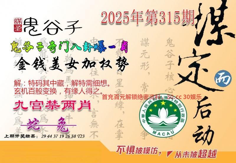 | 315期鬼谷子:金钱美女加权势 解释:“金钱美女加权势”这句话反映了一种社会现象和价值观,即在某些人眼中,金钱、美女和权势是衡量成功和幸福的重要标准 综合:狗龙虎羊牛猪马兔 |